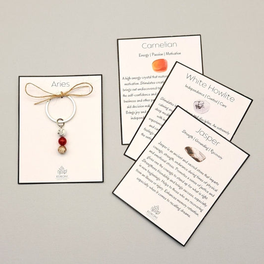 Are you an energetic Aries, always ready to conquer the world? The Carnelian stone on the Aries bead keychain will increase your natural fiery spirit, stimulating your passion and drive even more. Or maybe you're a dreamy Pisces, swimming in the deep seas of imagination? The Chalcedony on your keychain is your perfect match, enhancing intuition and bringing a sense of calm and peace. Or you are a proud Taurus? The Black Obsidian of your beads keychain will give you strength and would be your energy protection.
