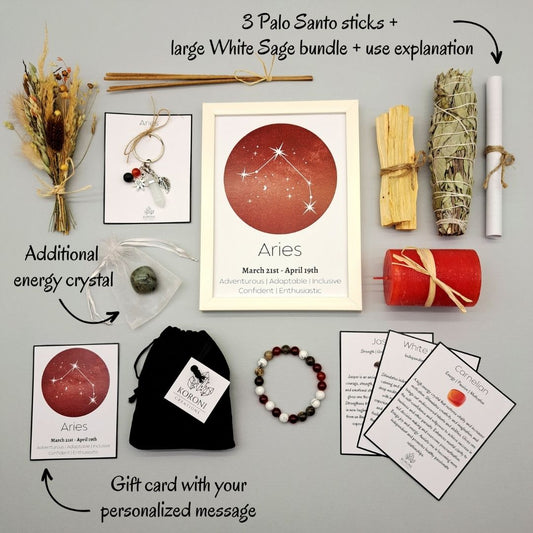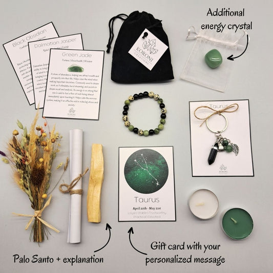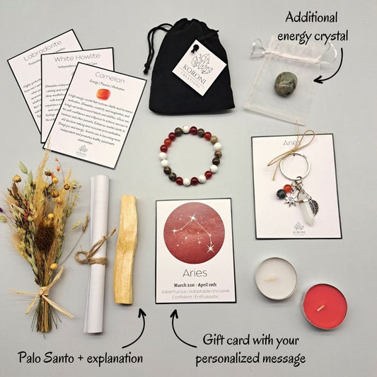 Tous les cristaux utilisés sont choisis pour leurs propriétés curatives ainsi que pour leur lien avec le signe du zodiaque spécifique. Par exemple, le coffret cadeau Bélier contient de la Howlite, du Jaspe et de la Cornaline – les meilleurs cristaux pour le Bélier, le coffret cadeau Taureau contient du Jade vert, du Jaspe dalmatien et de l'Obsidienne noire – les meilleurs cristaux pour le Taureau et plus encore.