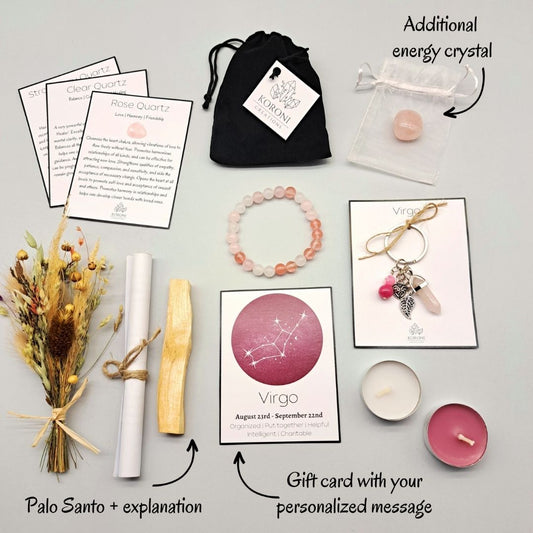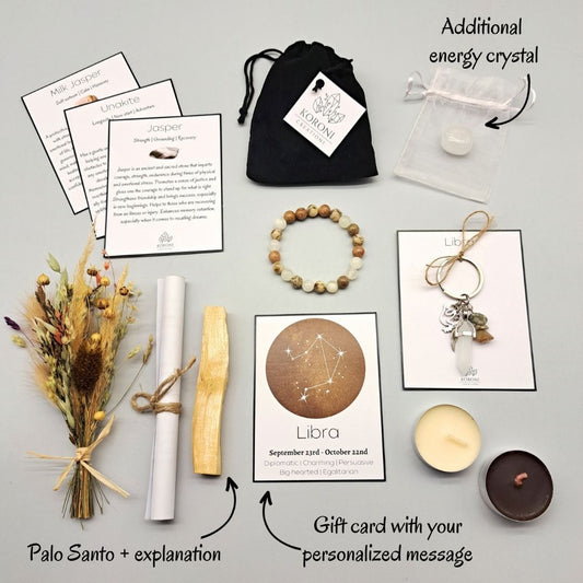 À l'intérieur de chaque coffret cadeau d'anniversaire, vous trouverez un bracelet de pierres précieuses de guérison et un porte-clés, tous deux fabriqués avec les meilleures pierres de naissance pour chaque signe du zodiaque. Ce sont toutes les deux de si belles pièces ! Ils sont également comme des charmes personnels qui renforcent les forces et répondent aux besoins d'une manière adaptée à chaque signe du zodiaque. Par exemple, dans le coffret anniversaire Vierge, vous trouverez un délicat bracelet composé de quartz rose, de quartz clair et de quartz fraise, tandis que le bracelet et le porte-clés du coffret cadeau Scorpion sont composés de jaspe rouge, de lapis-lazuli et de grès bleu. Choisissez le coffret cadeau du zodiaque du destinataire et vous pouvez être sûr qu'avec les pierres de naissance énergétiques incluses, il recevra bien plus qu'un simple cadeau d'anniversaire.