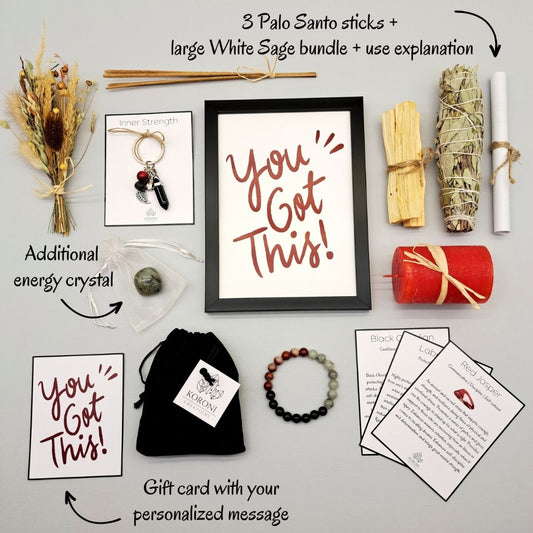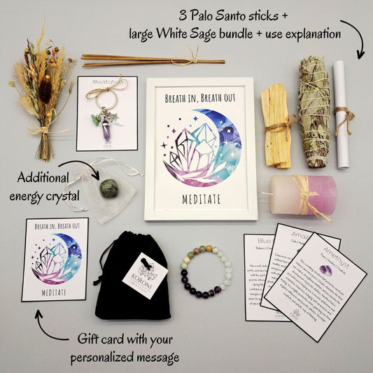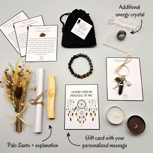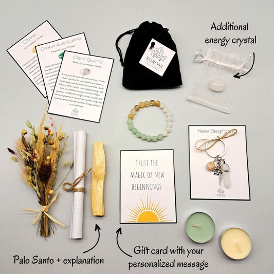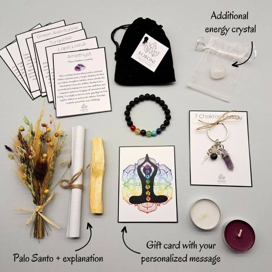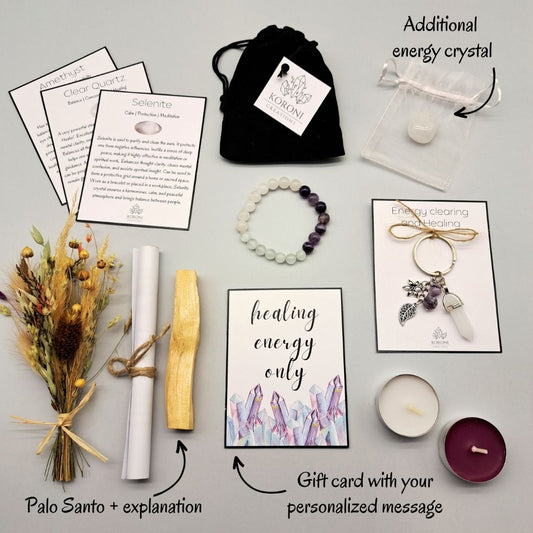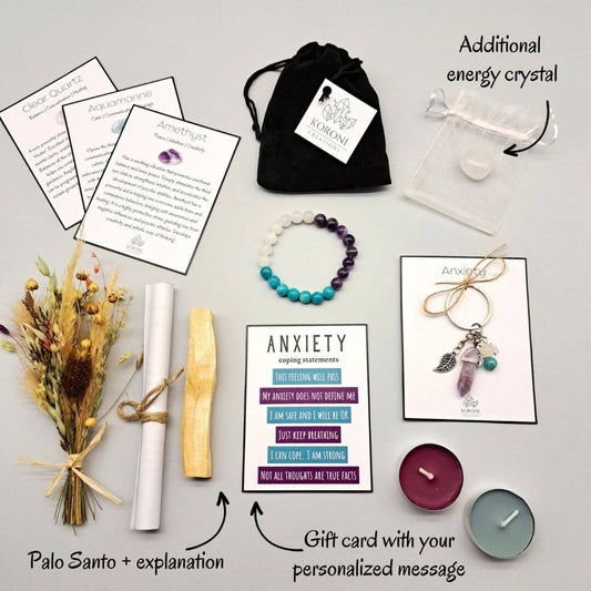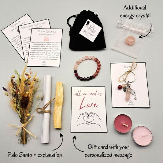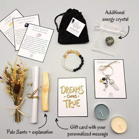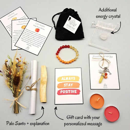 Chaque coffret cadeau contient un bracelet en cristal et un porte-clés en pierres précieuses. Chaque pierre utilisée pour ces articles est spécialement choisie pour ses propriétés énergétiques, afin qu'elles puissent correspondre à l'intention de l'ensemble de la boîte.