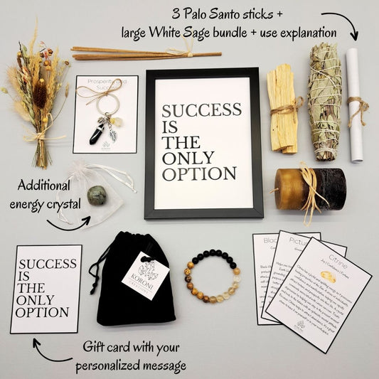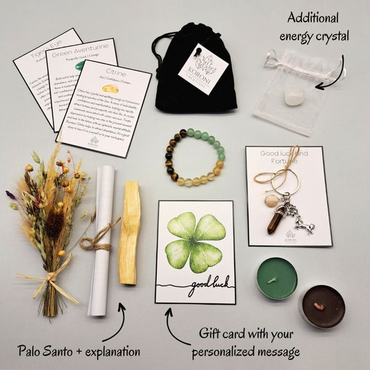 Chaque coffret cadeau de notre collection a son ambiance et son objectif uniques, vous permettant de transmettre précisément ce que vous souhaitez pour le destinataire. Imaginez offrir une boîte de Prospérité à un ami qui se lance dans un parcours entrepreneurial, ou une boîte d'Amour à un être cher ouvert à la recherche de nouvelles relations. Pour les personnes ayant besoin d'un regain de santé, notre coffret cadeau Get Well envoie des vœux de prompt rétablissement, tandis que le coffret Anxiété s'adresse à tous ceux qui recherchent la paix et le calme dans leur vie. Chaque coffret cadeau est une façon de montrer vos soins et vos souhaits, adaptés aux besoins et aux rêves de son destinataire.